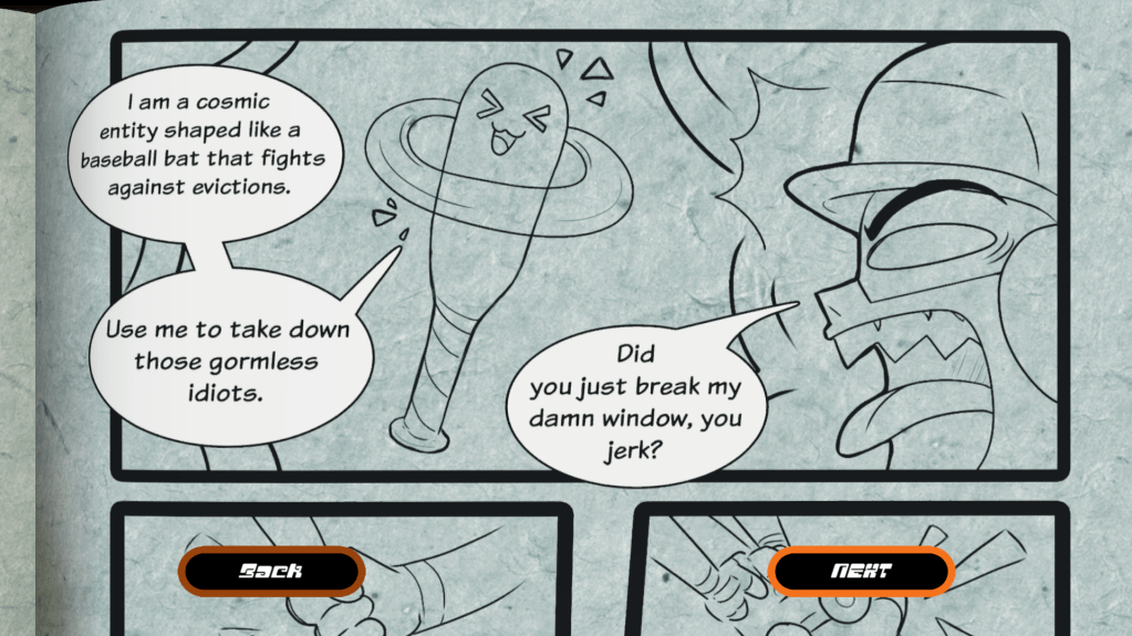 The antagonist and villain is the CEO of Neck Crushing Capitalism Inc., a ruthless figure driving the plot’s conflict. On the other hand, the player’s friend and ally is a nameless cosmic entity who fights against evictions and teams up with the player, introducing a central theme of solidarity.