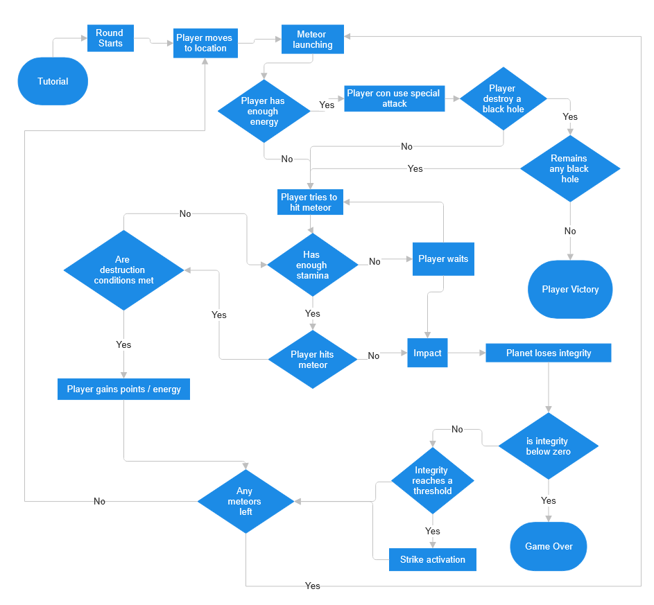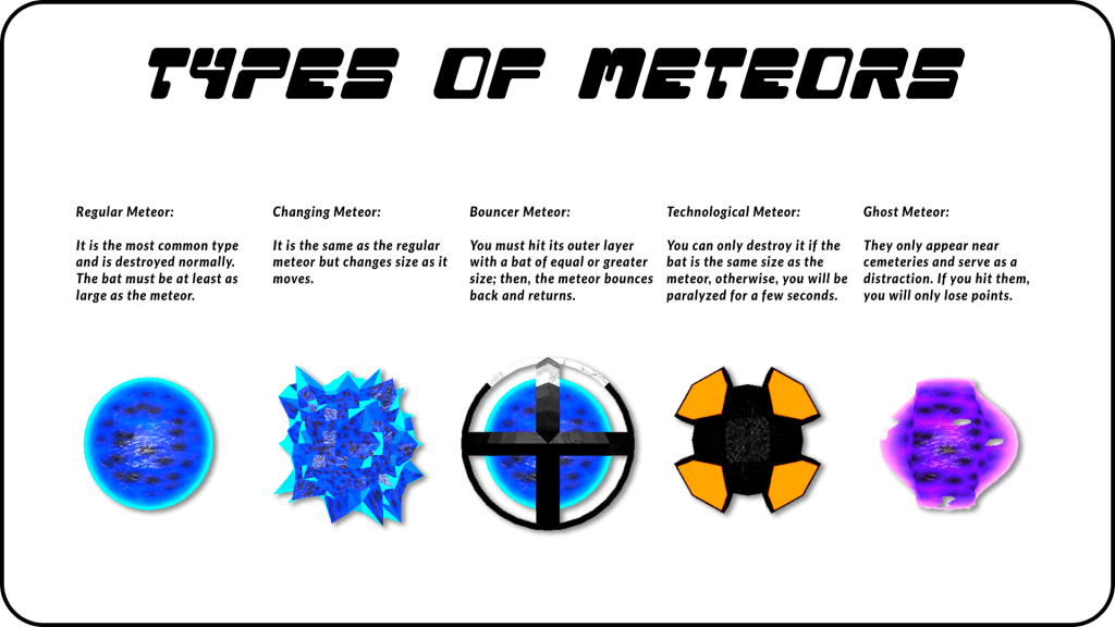 - Variety, orthogonality, and replayability. To achieve this, I planned several new types of meteors and a strike system that applies penalties to keep the game engaging.